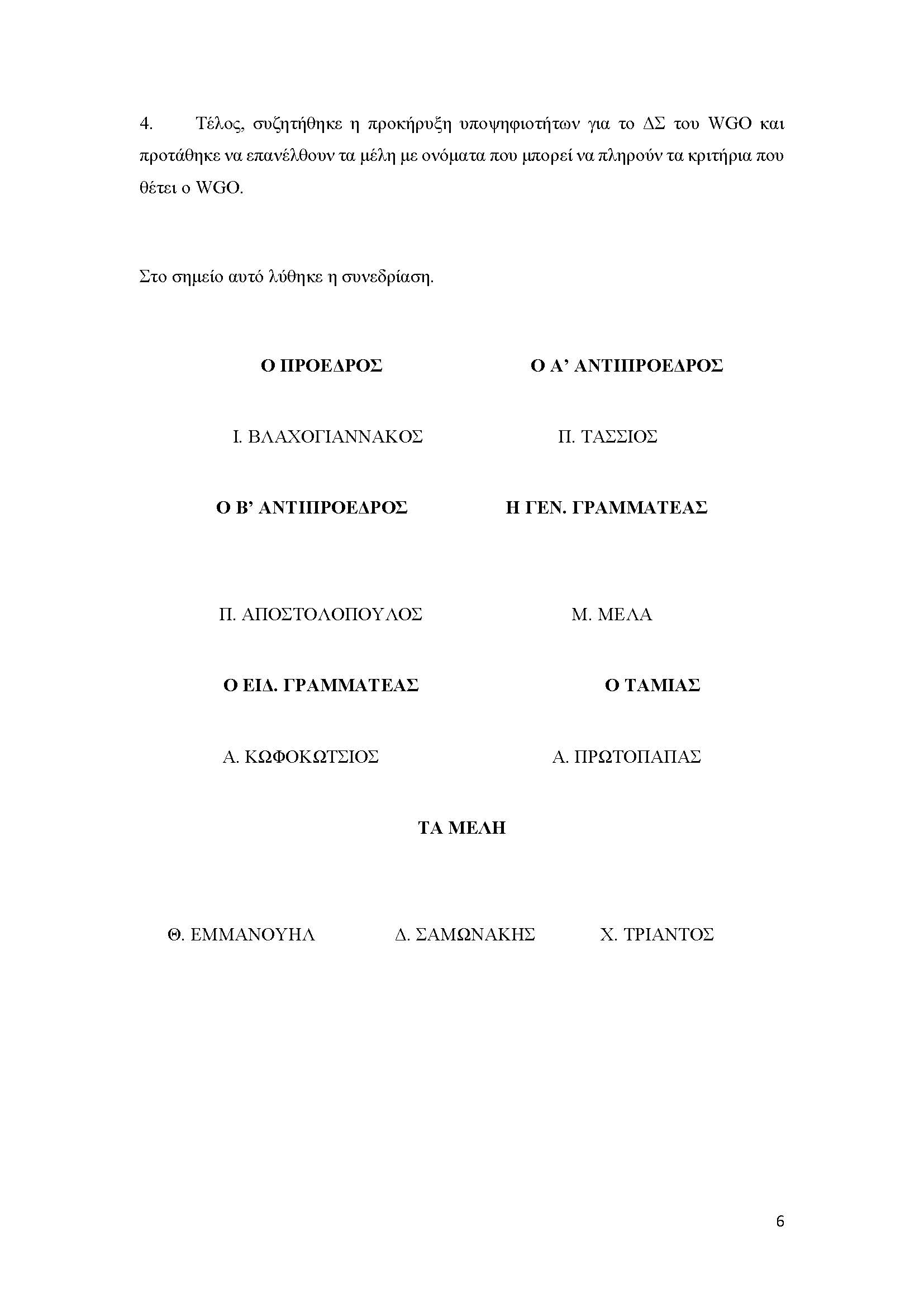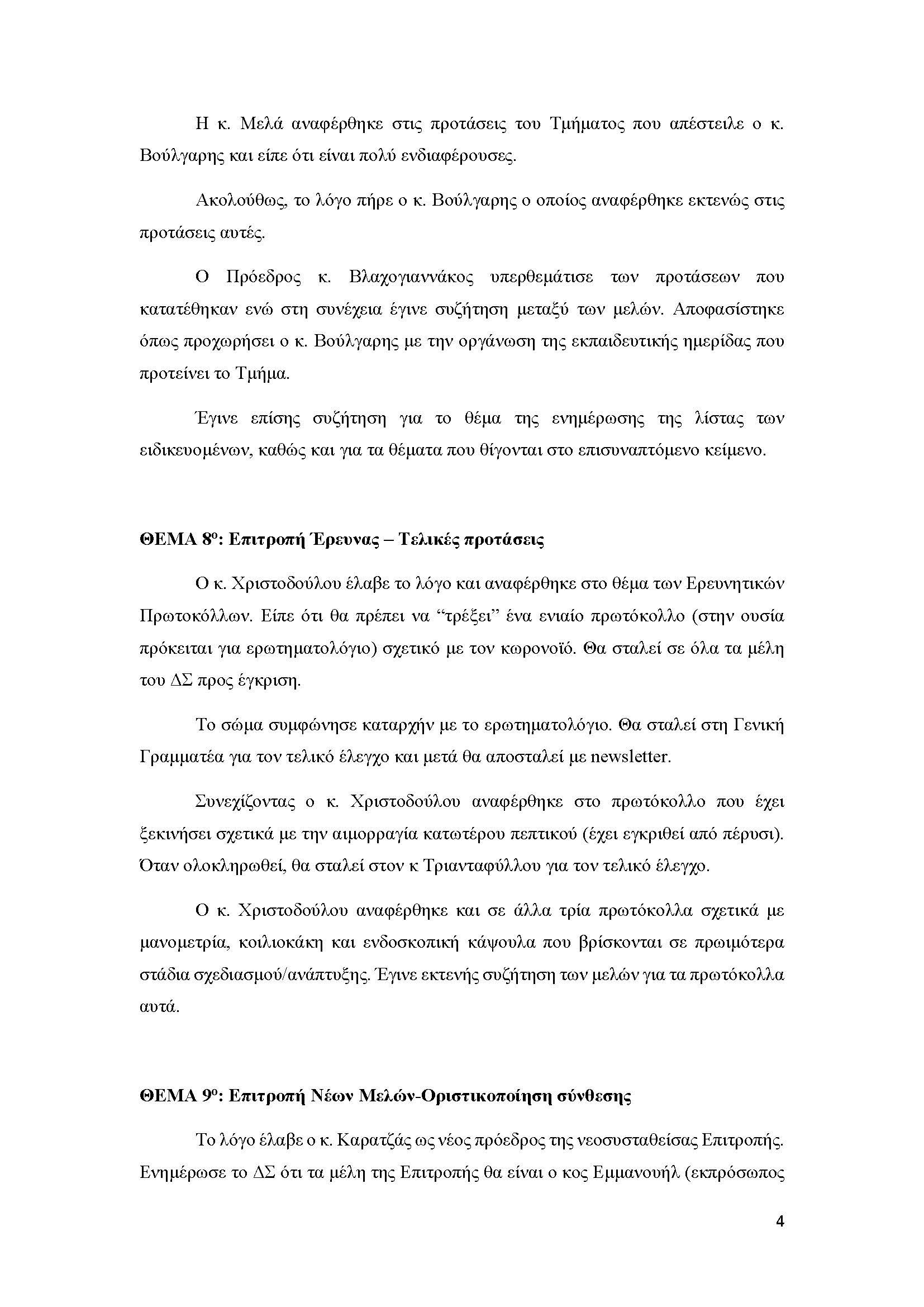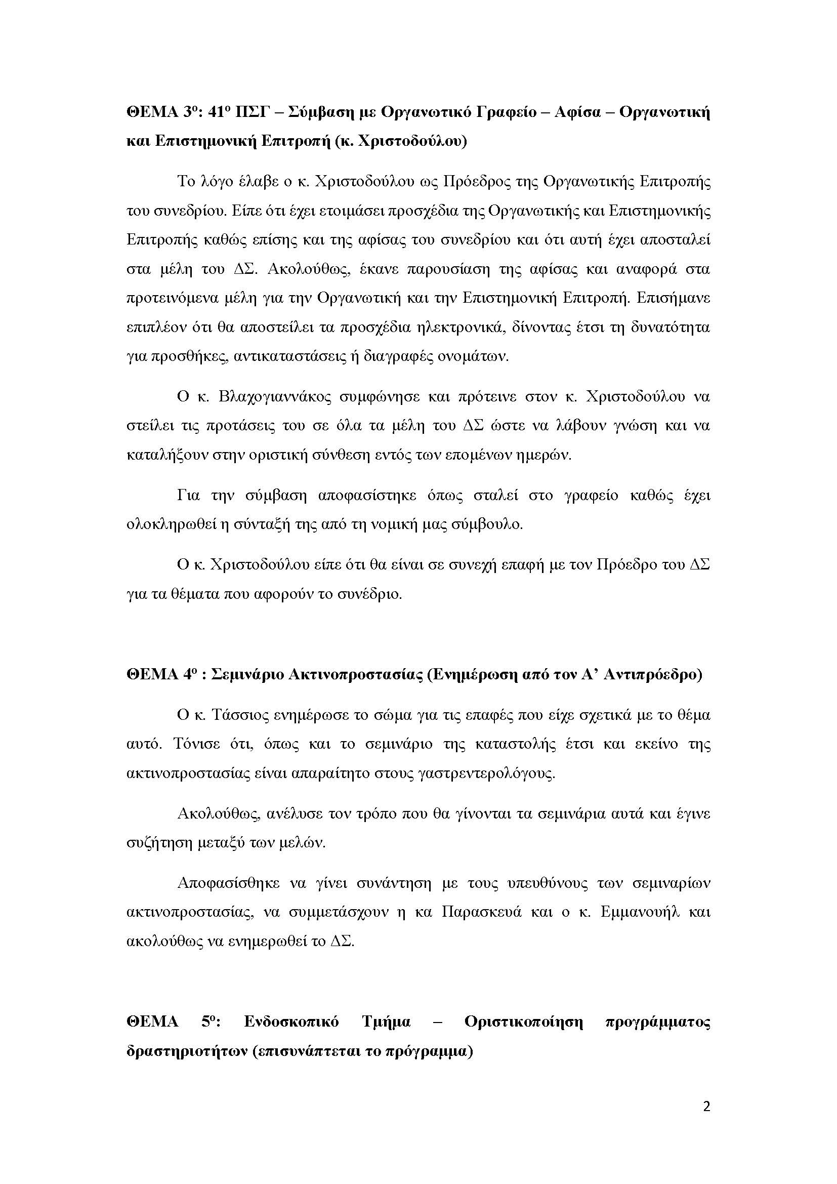 ΠΑΡΟΝΤΕΣ: Άπαντα τα μέλη του ΔΣ καθώς επίσης και η κα Κ. Παρασκευά – Πρόεδρος του Ενδοσκοπικού Τμήματος και η κα Α. Τσαλούκα – Πρόεδρος του Νοσηλευτικού Τμήματος της ΕΓΕ. Επίσης παρών και ο κ. Βούλγαρης – Πρόεδρος Τμήματος Δοκίμων Μελών. Παρόντες επίσης οι κ.κ. Δ. Χριστοδούλου και Π. Καρατζάς (Πρόεδρος Επιτροπής Νέων Μελών). Παρών και ο πρώην πρόεδρος κ. Τριανταφύλλου. Επίσης συνδέθηκαν και οι κ.κ. Θ. Κωτσίδης και Θ. Ξανθόπουλος και ο κ. Χ. Ζαβός για τα θέματα της ιστοσελίδας.