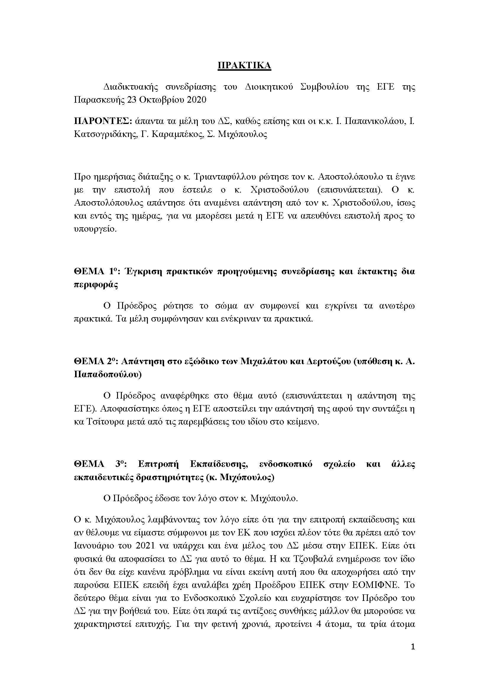 Πρακτικά Διαδικτυακής Συνεδρίασης 23ης Οκτωβρίου 2020