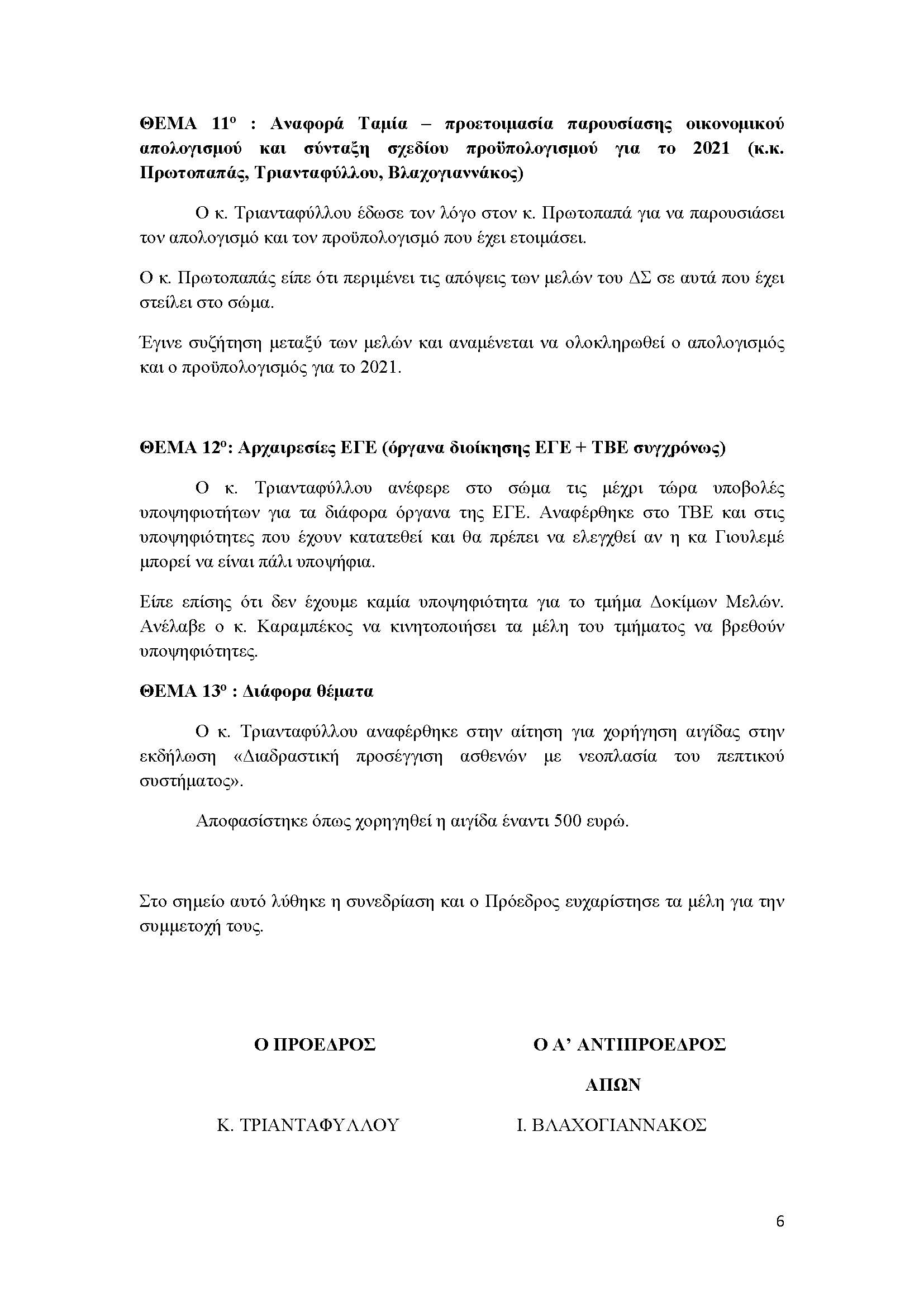 ΘΕΜΑ 11ο : Αναφορά Ταμία – προετοιμασία παρουσίασης οικονομικού απολογισμού και σύνταξη σχεδίου προϋπολογισμού για το 2021 (κ.κ. Πρωτοπαπάς, Τριανταφύλλου, Βλαχογιαννάκος)