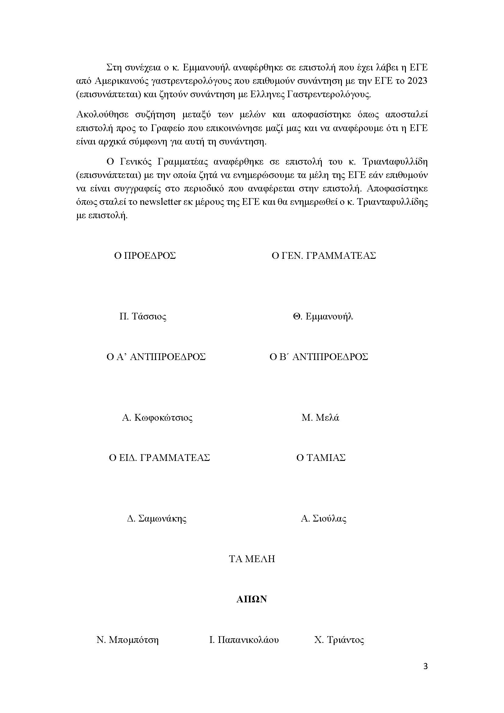 ΠΑΡΟΝΤΕΣ: άπαντα τα μέλη πλην του κ. Παπανικολάου. Παρόντες επίσης ήταν η κα Μανθοπούλου ως Πρόεδρος των Δοκίμων Μελών, η κα Παρασκευά ως Πρόεδρος του Ενδοσκοπικού Τμήματος, ο κ. Αυγερινός ως Πρόεδρος του Τμήματος Βορ. Ελλάδος και η κα Σιαμοπούλου εκ μέρους του Γραφείου διοργάνωσης του 42ου ΠΣΓ.