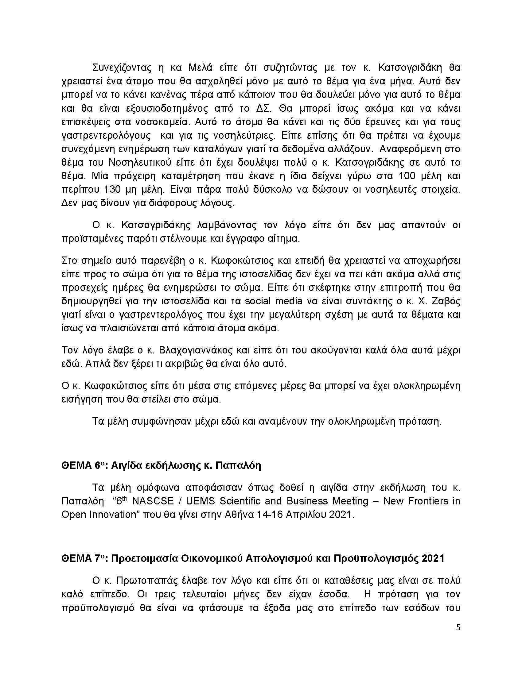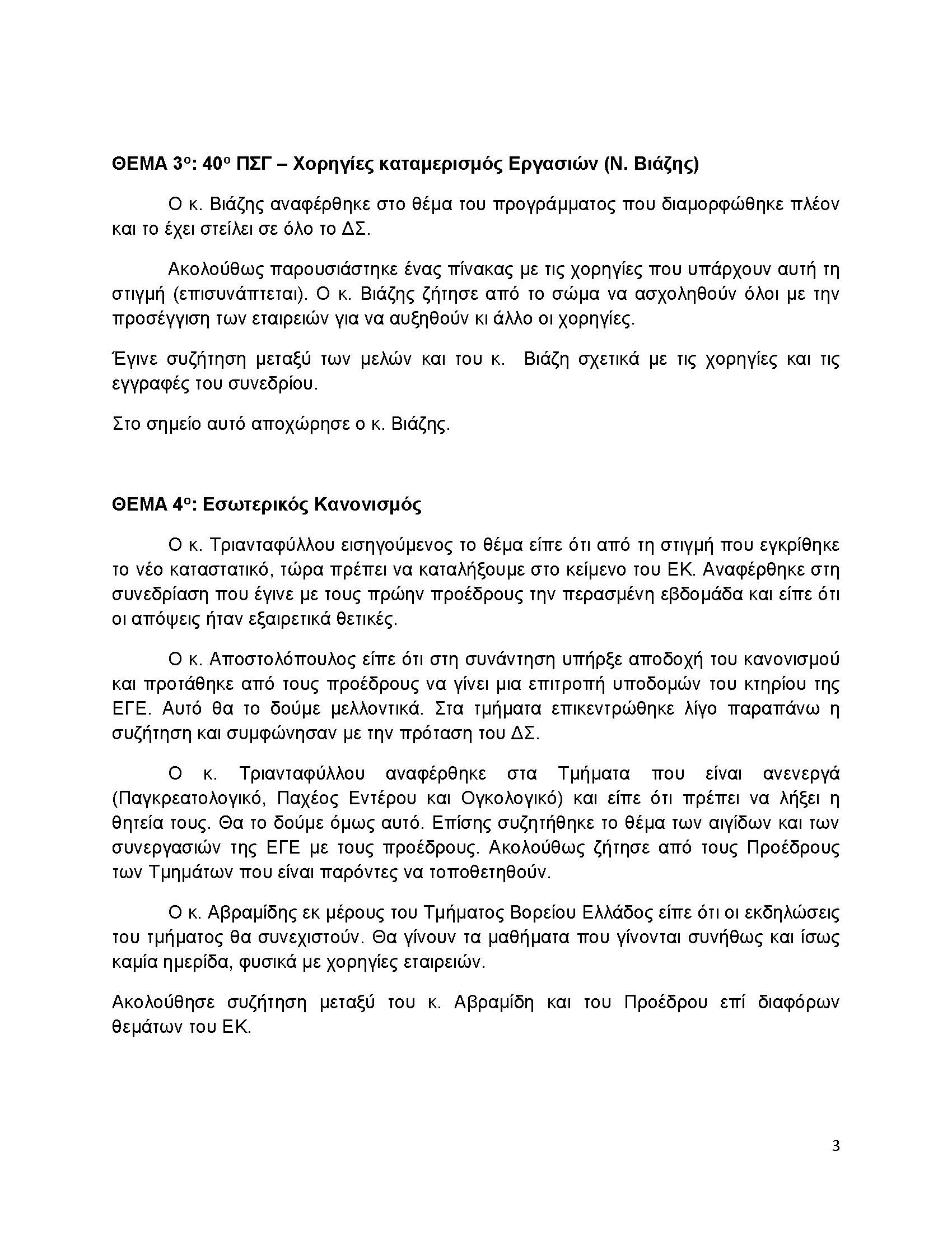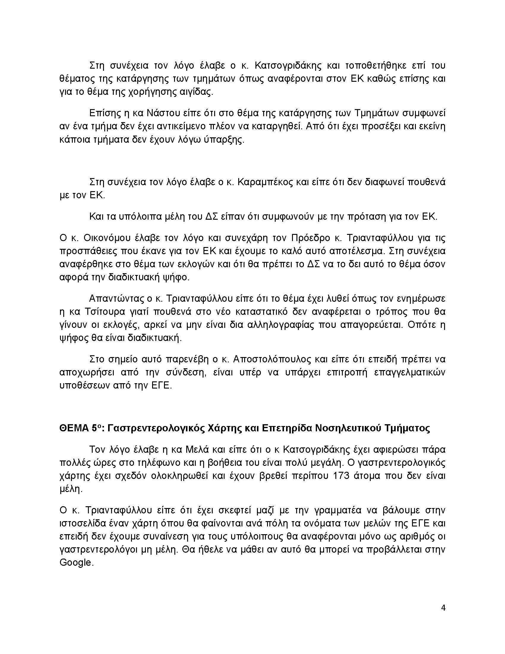 ΠΑΡΟΝΤΕΣ: άπαντα τα μέλη του ΔΣ καθώς επίσης και οι κ.κ. Παπανικολάου – Πρόεδρος Ενδοσκοπικού Τμήματος, Ι. Κατσογριδάκης – Πρόεδρος Τμήματος Παγκρέατος Χοληφόρων, ο κ. Ι. Αβραμίδης – Πρόεδρος ΤΒΕ, ο κ. Γ. Καραμπέκος – Πρόεδρος Δοκιμών Μελών, η κα Νάστου – Πρόεδρος Τμήματος Παχέος Εντέρου. Παρών επίσης και ο κ. Θ. Κωτσίδης για το θέμα της αναβάθμισης του αμφιθεάτρου της ΕΓΕ.