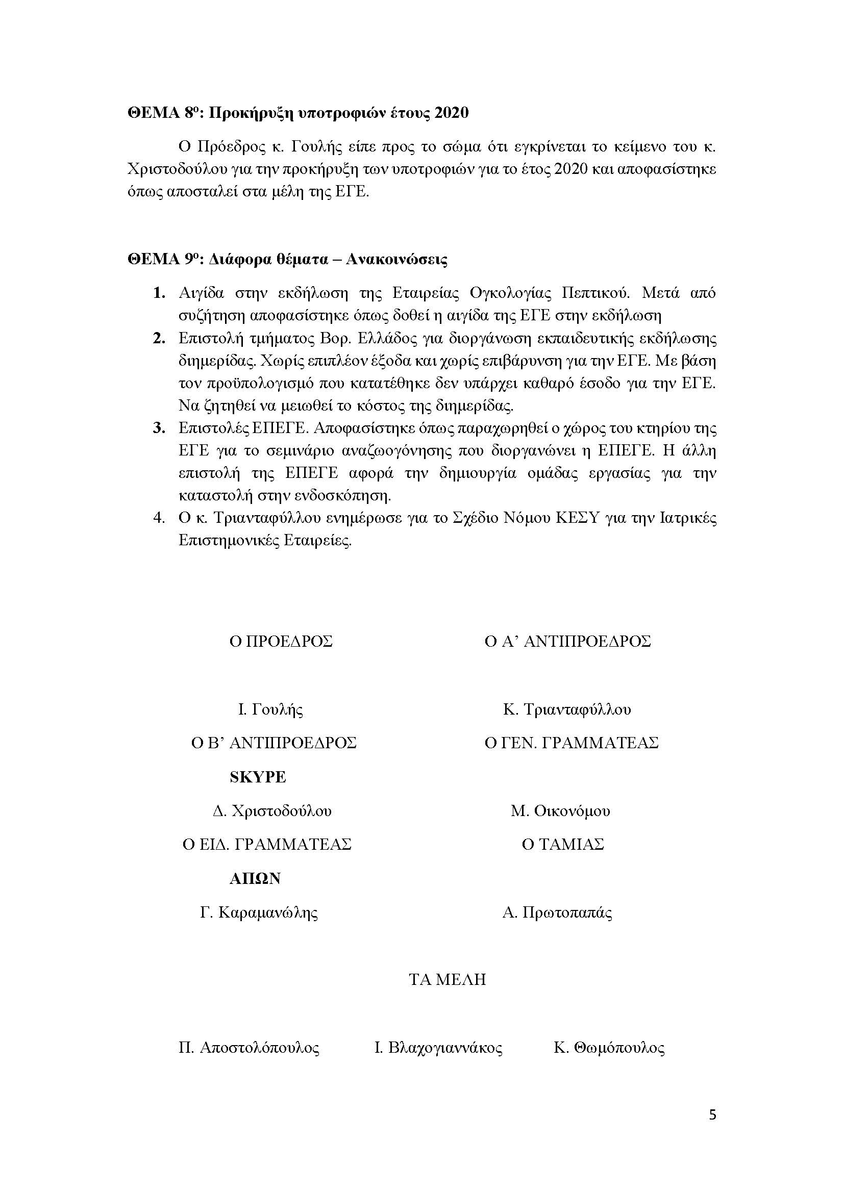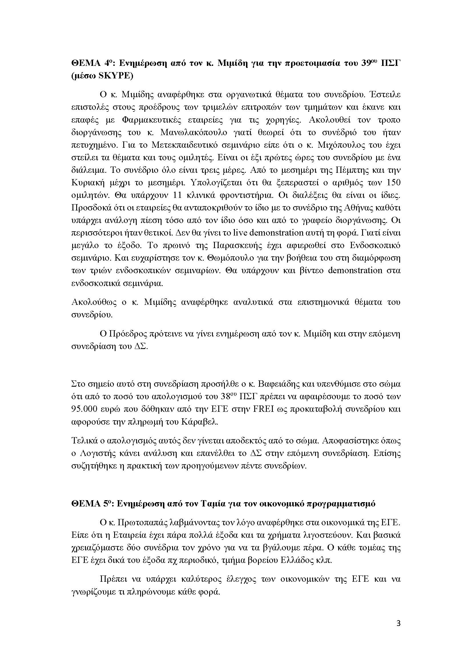 ΠΑΡΟΝΤΕΣ: άπαντες πλην του κ. Γ. Καραμανώλη. Ο κ. Δ. Χριστοδούλου συνδέθηκε μέσω Skype. Εκ μέρους των τμημάτων της ΕΓΕ οι κ.κ. Δ. Νάστου εκ μέρους του Τμήματος Παχέος Εντέρου - Πρωκτού, Ι. Καραϊτιανός από το Ογκολογικό και Ι. Κατσογριδάκης από το Παγκρεατολογικό. Παρόντες επίσης ο κ. Σ. Μανωλακόπουλος, η κα Ν. Γκαργκάσουλα και ο λογιστής της ΕΓΕ κ. Βαφειάδης για την συζήτηση του θέματος του απολογισμού του 38ου ΠΣΓ.